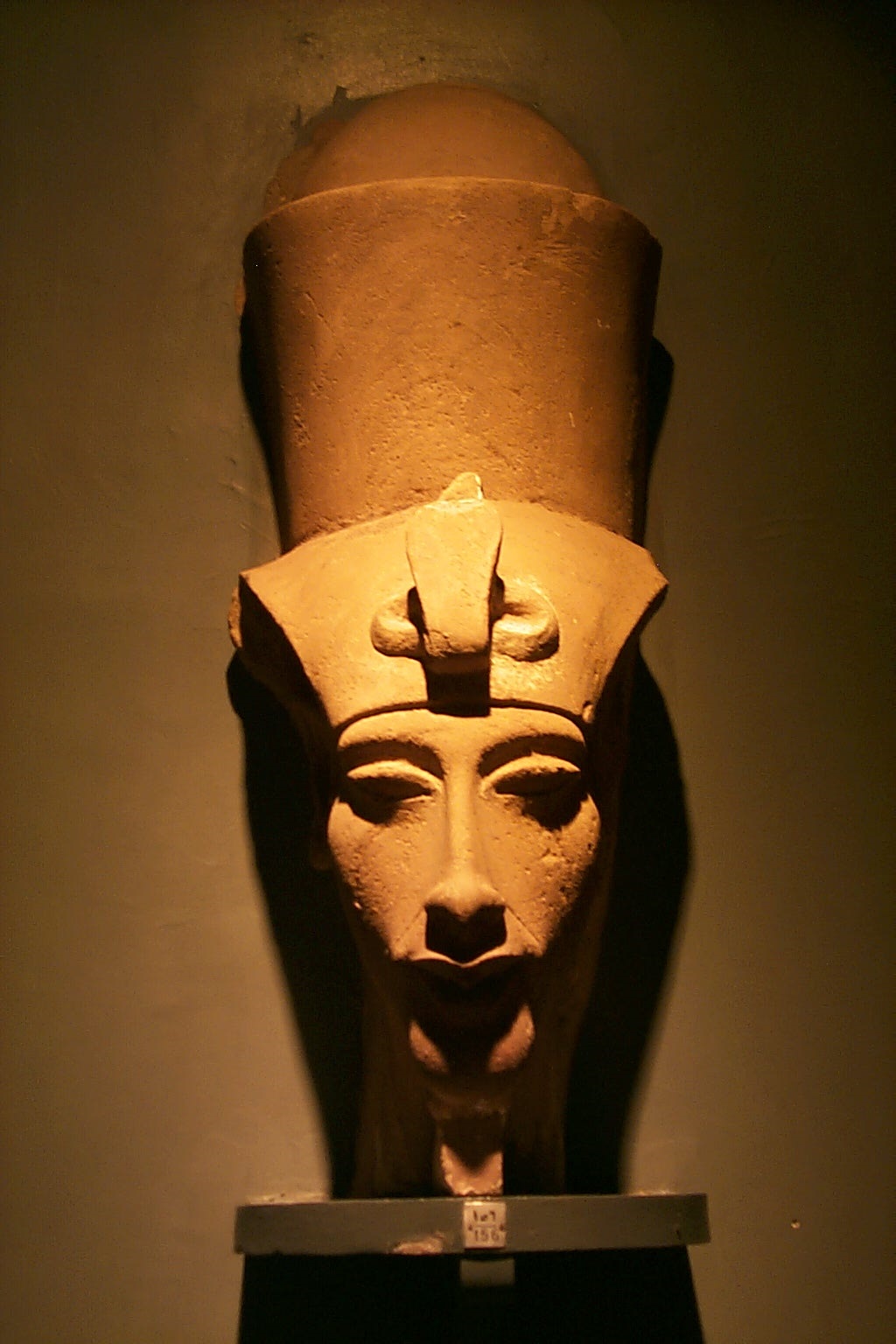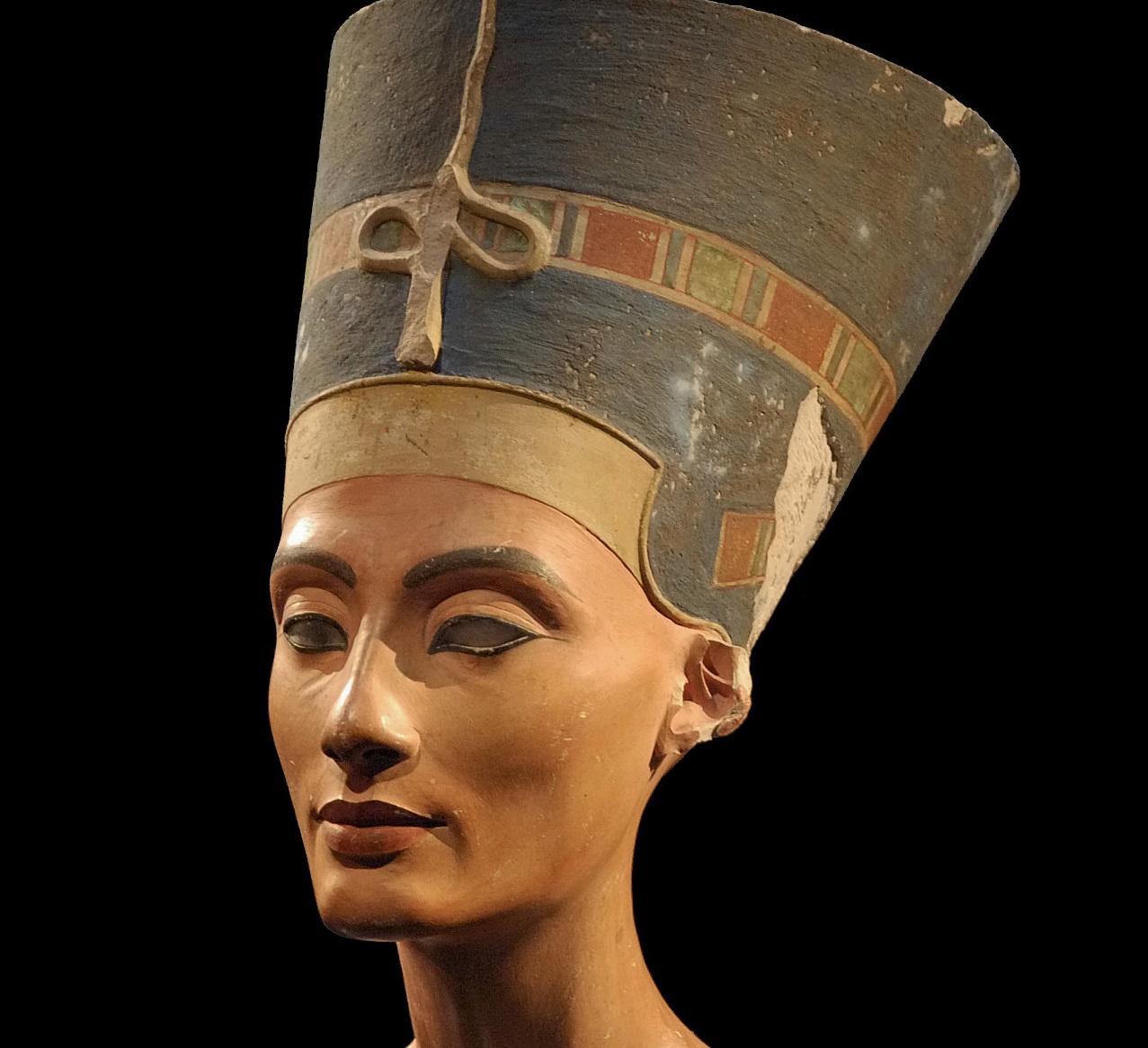 Vysoká modrá královská koruna se seříznutým vrškem je charakteristickým znakem Achnatonovy manželky Nefertiti (asi 1370–asi 1330 př. n. l.).