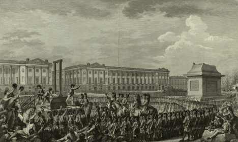 Kočár s Ludvíkem XVI. zastavuje kolem desáté hodiny dopolední 21. ledna 1793 na náměstí Revoluce (dnes náměstí Svornosti). Pod popravčím lešením král na chvíli zaváhá a zvědavě se zadívá na gilotinu.