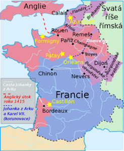 Francie od smrti Karla VI. (1368–1422) nemá korunovaného krále. Podle smlouvy, uzavřené roku 1420 v Troyes, má francouzský trůn připadnout Angličanům. Většina francouzské šlechty tuto skutečnost ale odmítá přijmout a podporuje dauphina Karla.
