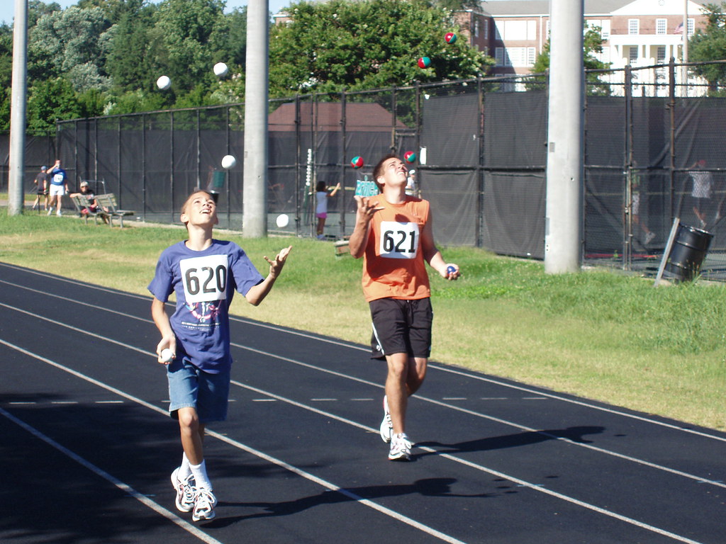 Běhá se na 100 nebo na 400 metrů a žongluje se při tom i s pěti nebo se sedmi míčky.