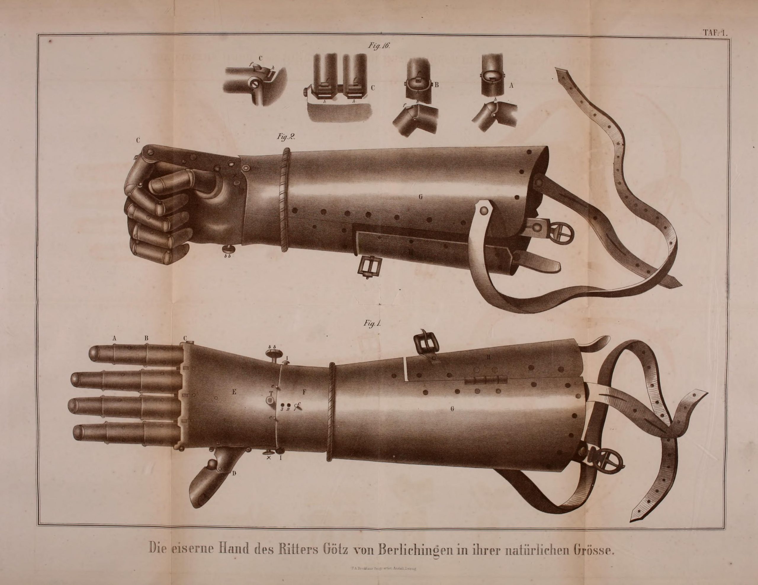 U řemeslníka si nechá zhotovit dvě protézy, přičemž jedna z nich je na svou dobu skutečně převratným technickým dílem. Díky sérii pérek může její nositel ohýbat prsty a díky tomu do ruky uchopí štít, jezdecké otěže nebo třeba brko na psaní.