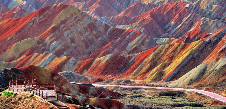 Duhové pohoří v provincii Kan-su na severozápadě Číny nabízí neuvěřitelný pohled. Červená žlutá, modrá, zelená… Zkrátka ohňostroj barev. Zdejší pestrobarevné hory jsou výsledkem vrstvení pískovce a dalších nerostů.