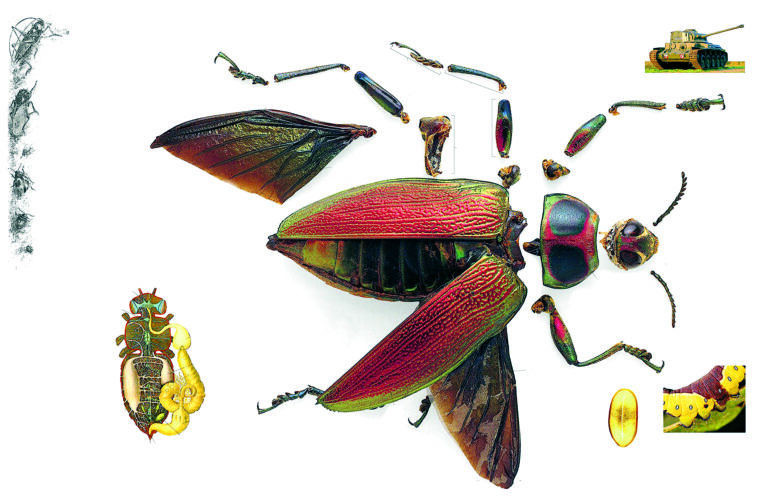 Tento brouk z Jižní Ameriky je typickým hmyzem s kloubovýma nohama a třemi výraznými částmi těla: hlavou, hrudníkem a břichem. Každá část má specifickou funkci, která zajišťuje přežití brouka v jeho prostředí.