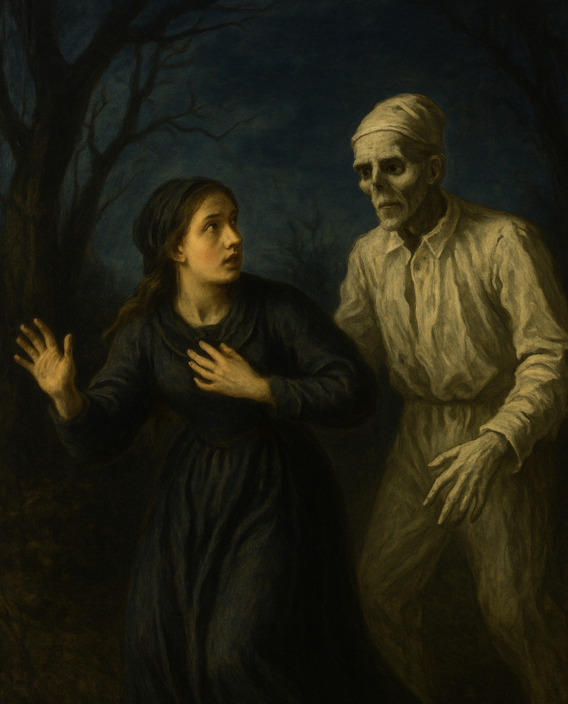 Ráno, po prožité hrůze, zůstávají na hrobech ležet roztrhané svatební košile, které dívka ušila a vzala s sebou, jako svědectví o noční hrůze.