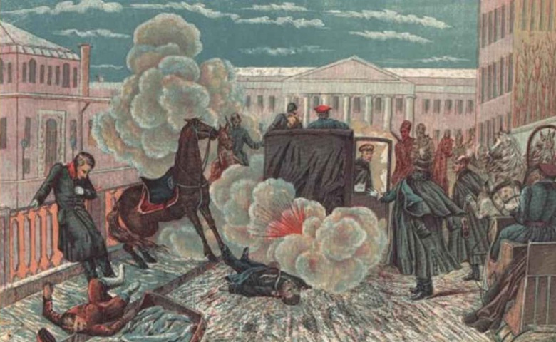 Čtveřice mu okamžitě vyrazí naproti. Sotva se přiblíží, Nikolaji Rysakovi (1861 – 1881) se podaří hodit nálož. Po ohlušující ráně zůstává na ulici ležet chlapec, dva kozáci z carské eskorty a koně. Carův kočár se kymácí ze strany na stranu a všude se šíří dým.