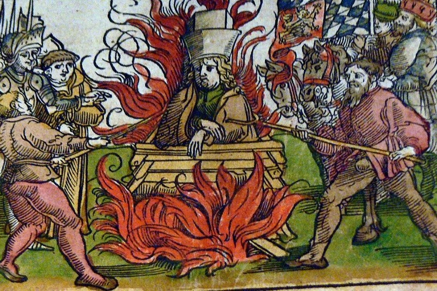 Diváci tak krásně vidí hořící osobu. V popsaném ohnivém divadle si libuje španělská inkvizice, upalují tak ale i na území Německa nebo Švýcarska. Takový konec čeká i českého reformátora Jana Husa (asi 1369–1415).