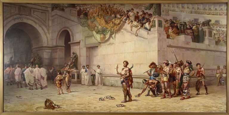 V aréně si to římský císař Commodus (161–192) vyřizuje s dobytkem za mohutného povzbuzování senátorů, kteří mocně křičí: „Jsi náš pán! Jsi vítězem a budeš vítězem!“ Císař se po těch slovech vždy dme pýchou.