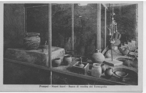 Místnost thermopolia má rohový stůl, do kterého se zapouštějí hliněné nádoby, a do nich se vkládají jídla. Někdy si jídla mohou lidé také vzít s sebou zabalená do fíkového listu. V menu zde najdeme směsi fazolí, čočky nebo jiné zeleniny, ale také dušené maso.