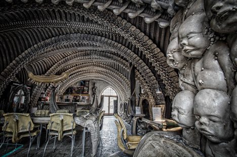 Giger–bary. Stylizované podniky, pro které navrhuje design interiéru, od vstupních dveří, přes stěny, křesla, stoly až po lampy.