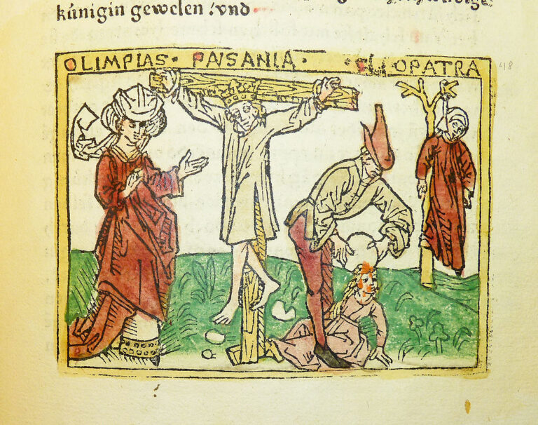Tři rány dýkou, vedené na Alexandrův popud, byly smrtelné,“ líčí událost, která se stala roku 336 př. n.l. v Aigách, řecký historik Plútarchos (asi 46‒asi 127). Když Pausanias po atentátu utíká, u městské brány zakopne o kořen vinné révy. Probodnou ho pak členové Filipovy stráže.
